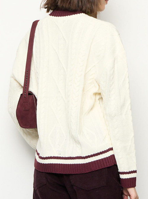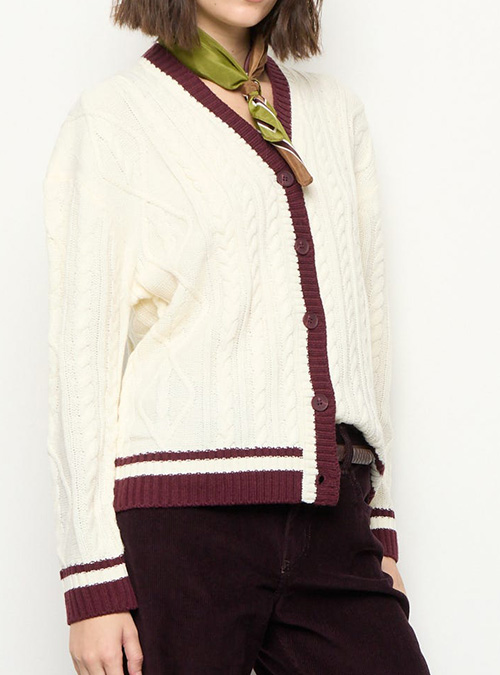Diseño con trama trenzada clásica. Escote en V con cartera frontal y botones veteados. Terminaciones en rib en cuello, cartera, puños y ruedo.