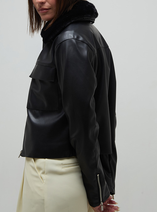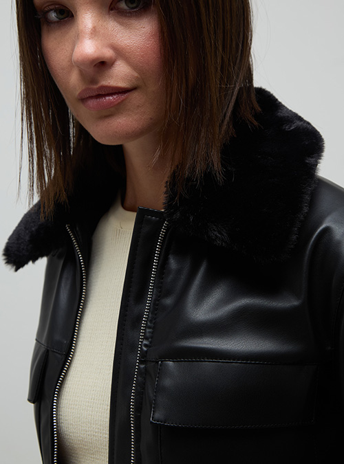 Chaqueta crop de eco cuero, con cierre y cuello con peludo desmontable.