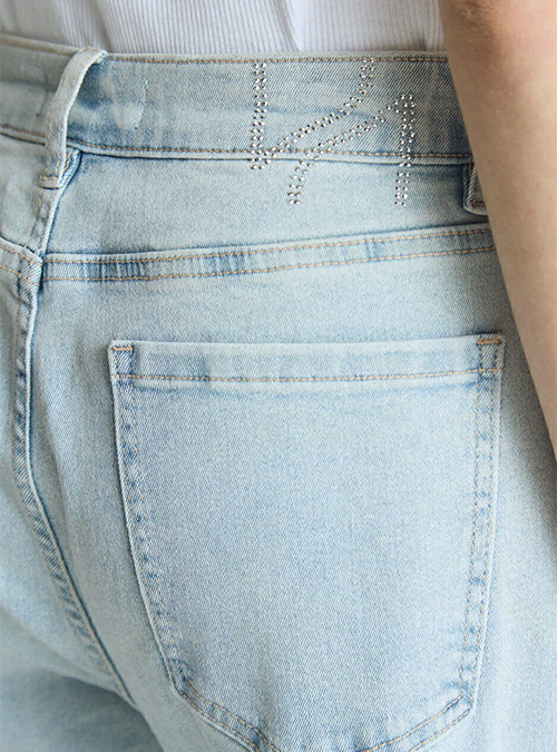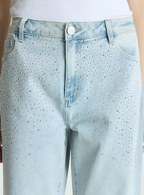 Jean recto tiro medio con strass en degrade, sutil, en la parte delantera; lona elastizada con calce slim.