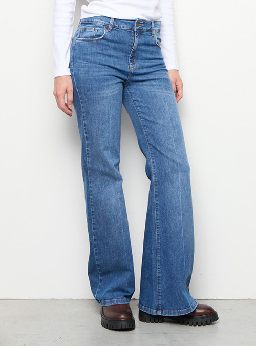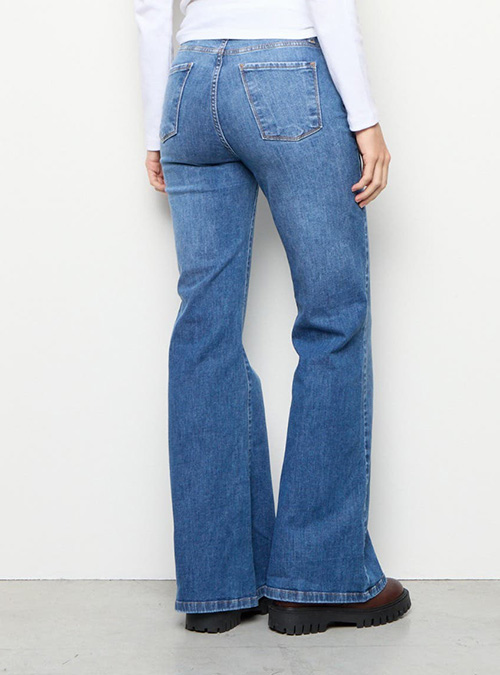 Pantalón cinco bolsillos, tiro alto, calza en caderas y muslos con piernas ajustadas hasta la rodilla que se amplían hacia el bajo, formando una silueta flare en largo full length.