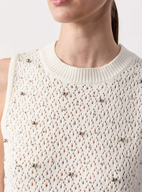 Confeccionado en tejido calado de punto algodón con perlas metálicas en el frente. Ideal para un look más arreglado!
